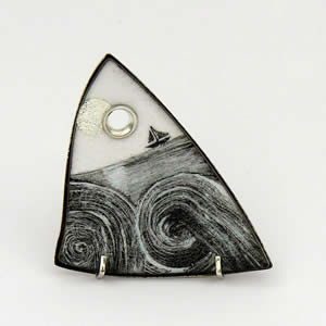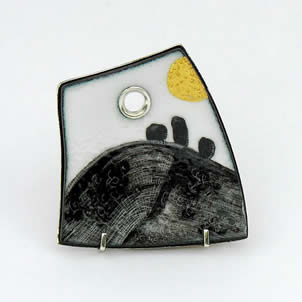 My series of pendants developed from overlaying an image of dried mud patterns of a desiccated waterhole over a shallow bowl. The bowl was then dissected and each piece became a fragment on which to work. When I studied at art school, before following a path into enamelling and jewellery, I loved drawing with pencil on paper. My creative life seems to have an underground river that connects my past and present. Themes and images return and present themselves in new forms for re-examination through my current understanding, perception and knowledge. There is a comforting continuum. Bringing the drawing technique to my jewellery and the larger scale of the vessel has been both challenging and immensely enjoyable.